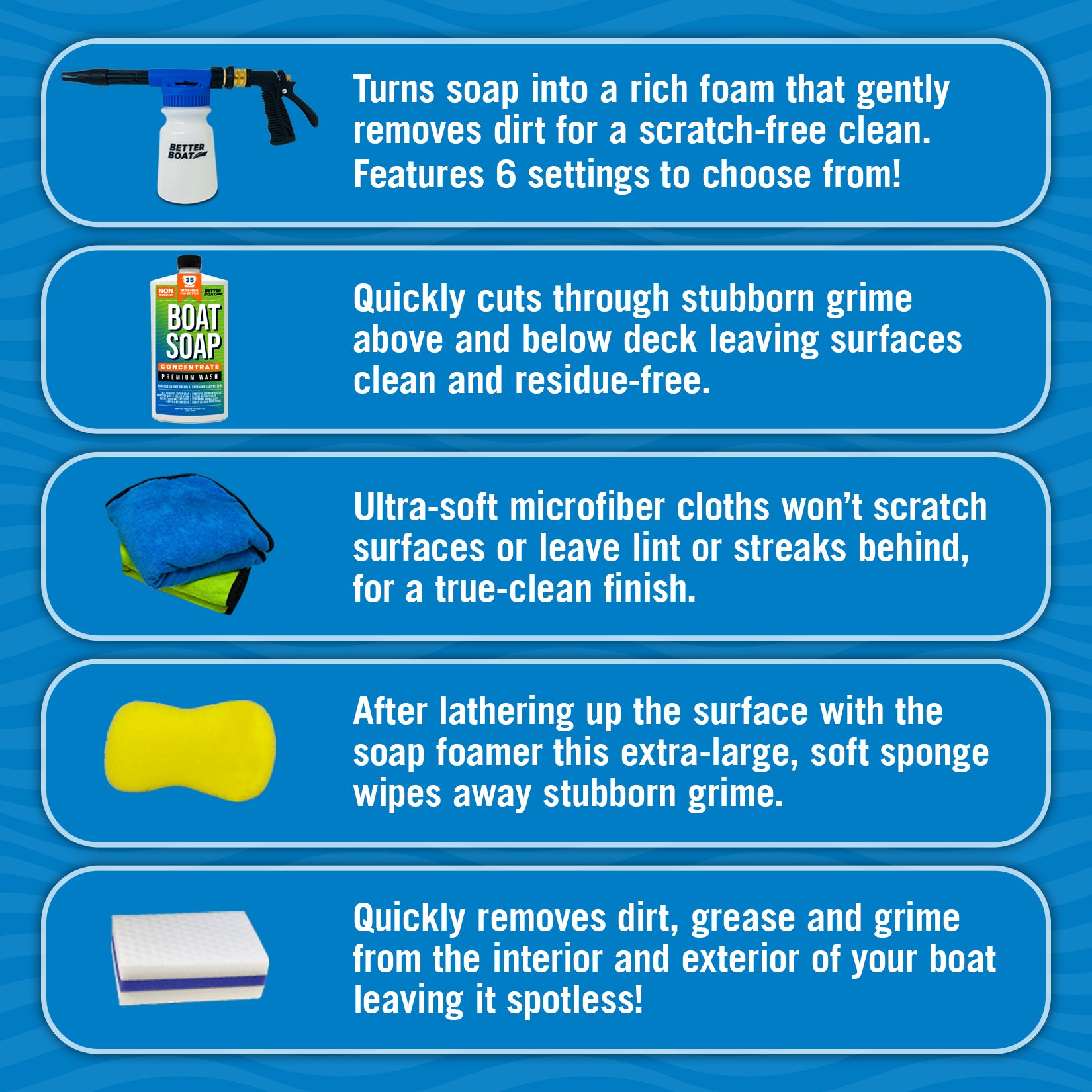 COMPLETE BOAT CLEANING KIT: Our Boat Cleaning set includes Boat Soap, Foam Gun Cleaner, Large Sponge, 2 Microfiber Cloths, the Original Boat Eraser, Detailed instructions & Gift Box to complete the boat accessories set. The Ultimate in Boating Gifts