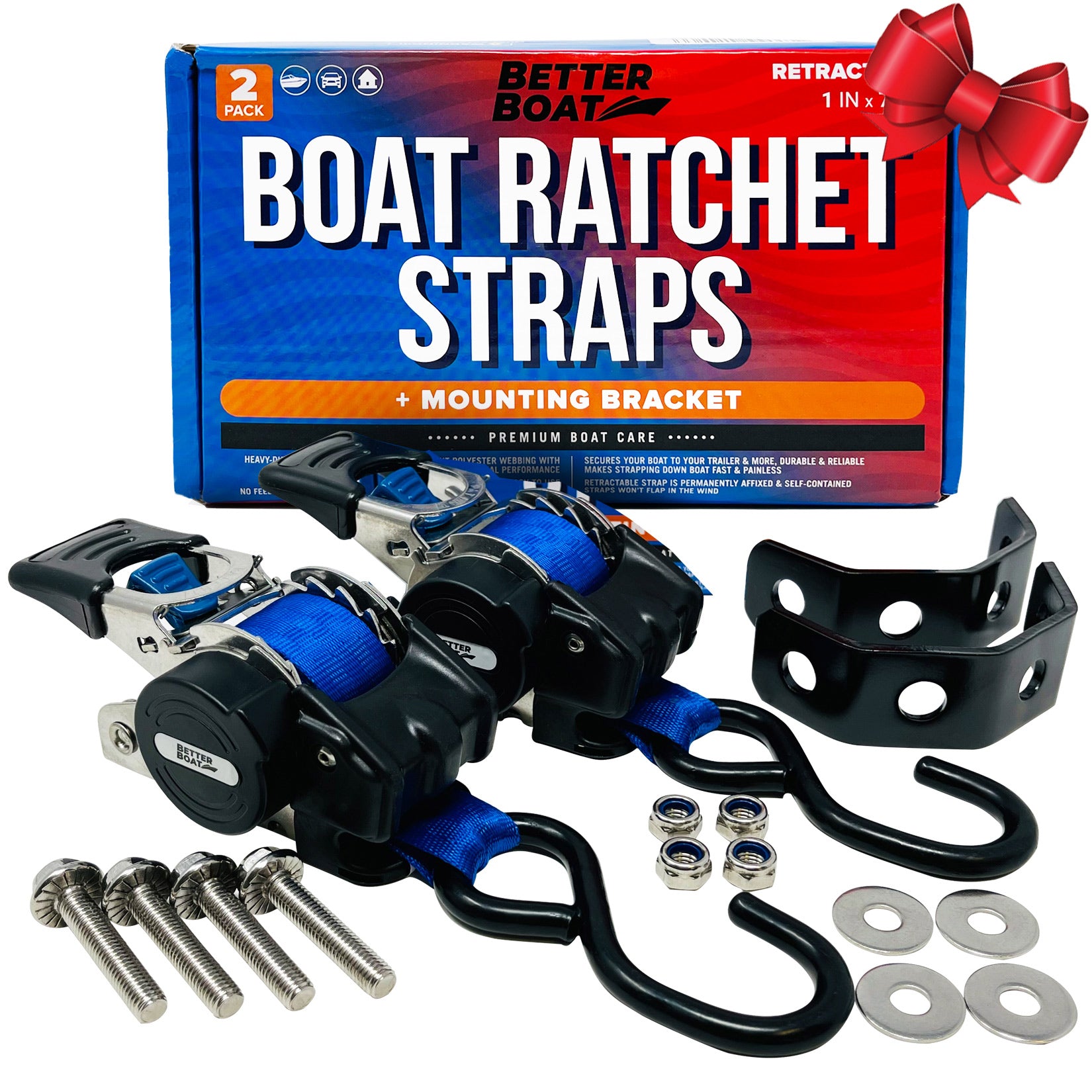 Our premium grade stainless steel boat ratchet tie down straps are made to ensure safe transit of your boat bouncing about on the trailer while you transport it. Unlike traditional ratcheting straps for boat trailers, this boat trailer tie down comes with a quick-release buckle and patented retractable mechanism to easily and efficiently adjust and fasten your straps. The retractable boat tie down feature on these ratchet transom tie downs also allows easy storage of this boat straps trailer tie down. Bolt the ratchet portion to your trailer and attach the rubber coated hook end to your transom, boat, jetski or anything to secure your load. Our transom straps for boat has an assembly break strength of 1800 lbs and a working load limit of 600 lbs. These retractable boat ratchet tie down straps are a great purchase and provide you with a long-lasting hauling solution. We proudly stand behind the quality of all our products. We are a family-owned American business committed to making premium quality products and exceptional customer support.