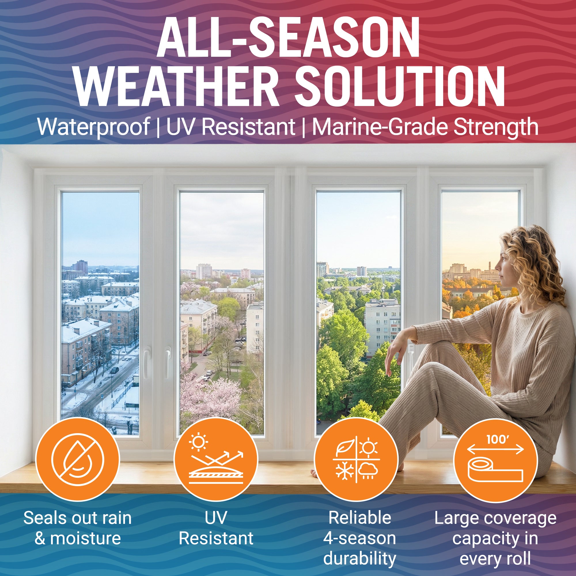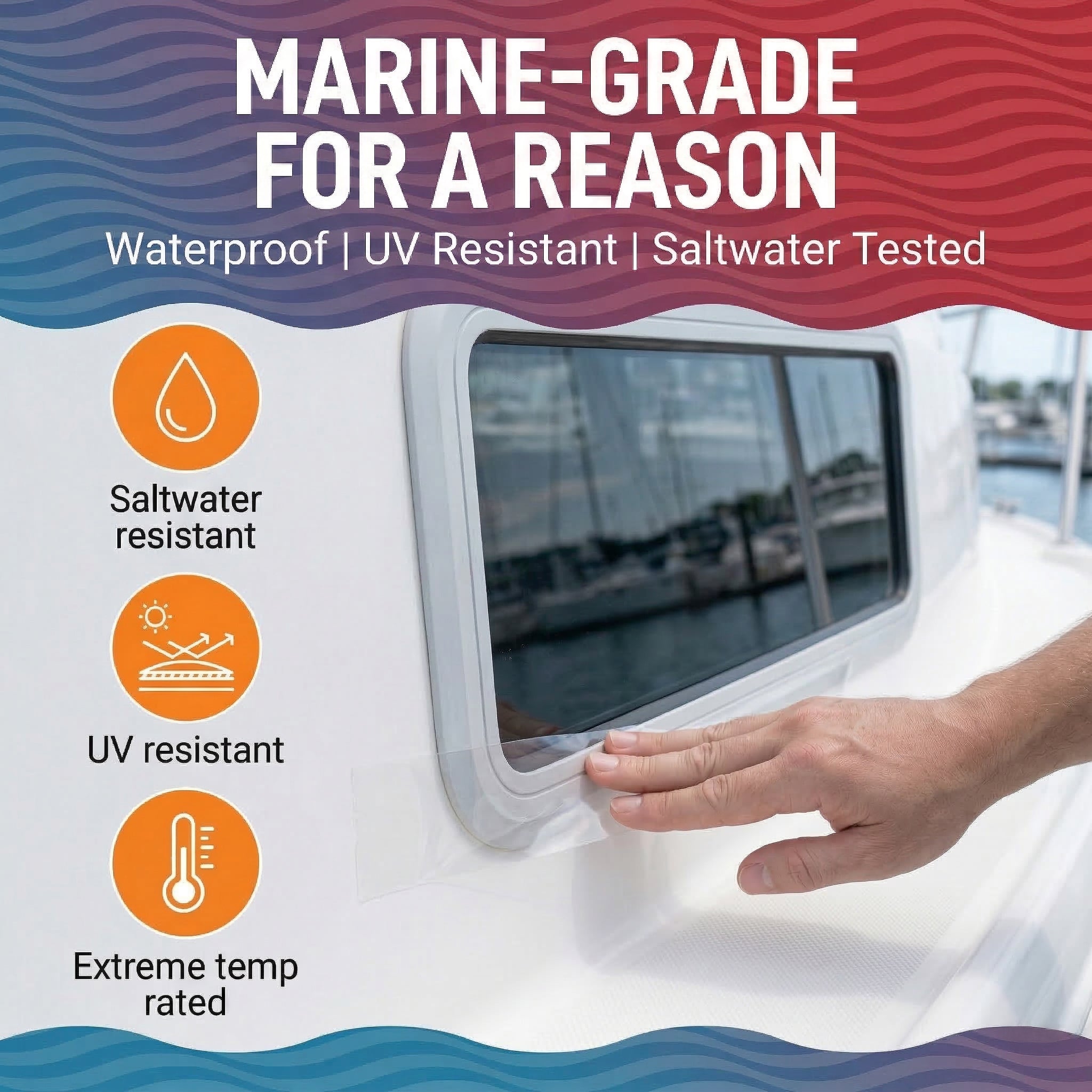 Marine Grade, Not Hardware Store Grade: Bargain window tape cracks, curls, and peels when temperatures swing. This tape is built to the same standard as boat weatherproofing. UV resistant, waterproof, and engineered to hold through full freeze and thaw cycles. It does not know the difference between a Miami summer and a Minnesota winter.